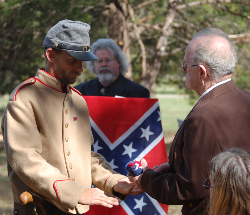 We are proud to be the grandsons of a man who served his country, in a cause he believed in, who persevered through tremendous hardship and danger to return to his family.  We are proud to come from a family that had the courage and optimism to push westward in search of a better life and to build our great country.  We are proud to be farmers, continuing in the tradition of many generations of our family.  Today, we are especially proud to gather at his gravesite, to honor his contributions to our country and keep his memory alive.  We thank the Sons of Confederate Veterans, W.H. Howdy Martin Camp #1241, for taking the care and interest in one lowly Private’s grave to ensure it remains properly marked for future generations to reflect upon.  A terrible war nearly destroyed our young country; we are blessed in that — unlike so many other countries who have endured civil war, unlike so many enemies who have misjudged us — our differences are less important than our common bonds and we remain one country, indivisible, with liberty and justice for all.