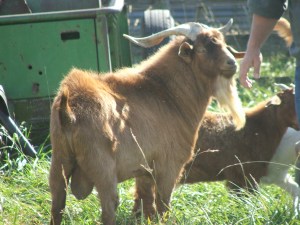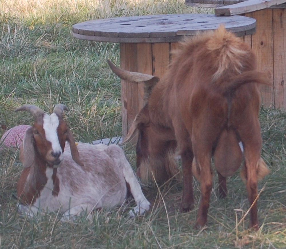 Normally these two are affectionate and docile. Of course, when they saw the two of us coming into the barn at an odd time of day, they were instantly suspicious. We took on Patch first, and found that the best approach was for Chris to take the buck for the horns and for me to make the approach. A little soft conversation and some petting seemed to be better than making a direct dive for the object of interest. I decided against the “tug and pull” method and opted for the natural conformation instead.