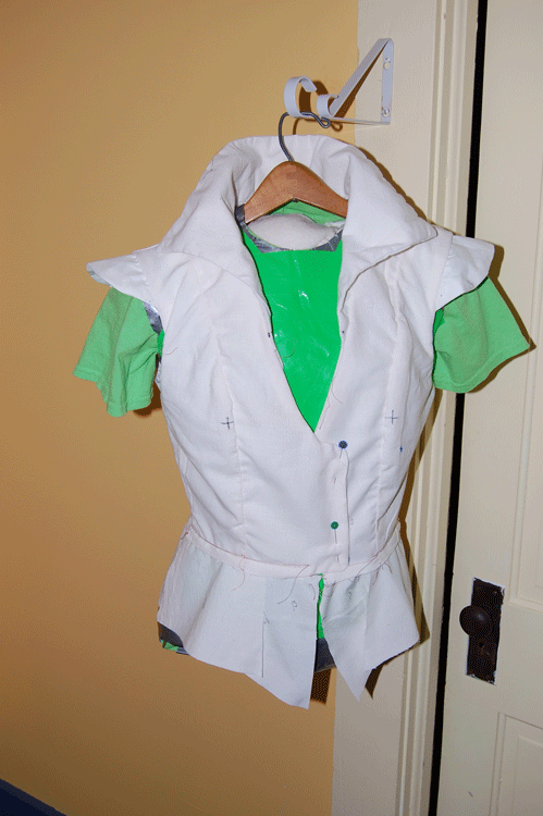 I made up the edited McCall’s 6819 jacket first, without the skirts. (I made the duct tape dress form of my daughter about a year ago, so I have a lot of confidence in sizing my patterns for her.) I can see that the sides can be taken in about an inch in order to make it fit more closely than the pattern calls for, and that the shoulders should be taken in about 5/8 inch.