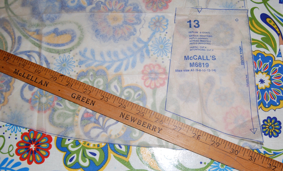 piece and aligned it with the front center edge of the skirt. Using the bottom of the peplum piece as a guide, I lined up my ruler and marked the angle across the bottom of the skirt.