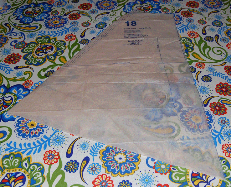 I laid out the front skirt pattern and measured the length. Keeping in mind that this length includes seam allowances for the waist and hem, I subtracted the desired skirt length, which gave me the amount by which I needed to shorten the pattern. Using the indicated line on the pattern for lengthening and shortening adjustments, I folded the pattern down to subtract the necessary length.