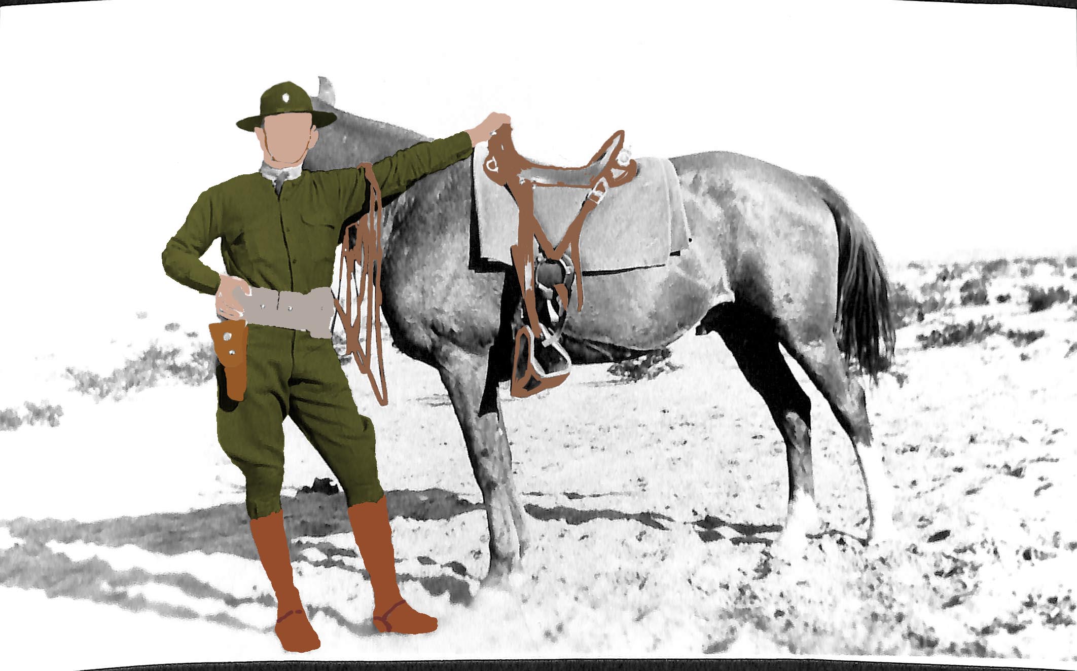For the uniform parts and saddle leathers, I went hunting for quality images of artifacts from the era and then used them to sample colors.  I played with the eyedropper tool to vary between point-selection and larger patches to get an overall color; I found that enlarging the sample patch helped to get a better color average for the item.  I used different leather colors for pieces of the holster, boots, spurs, chinstrap, and saddlery to add natural variation.