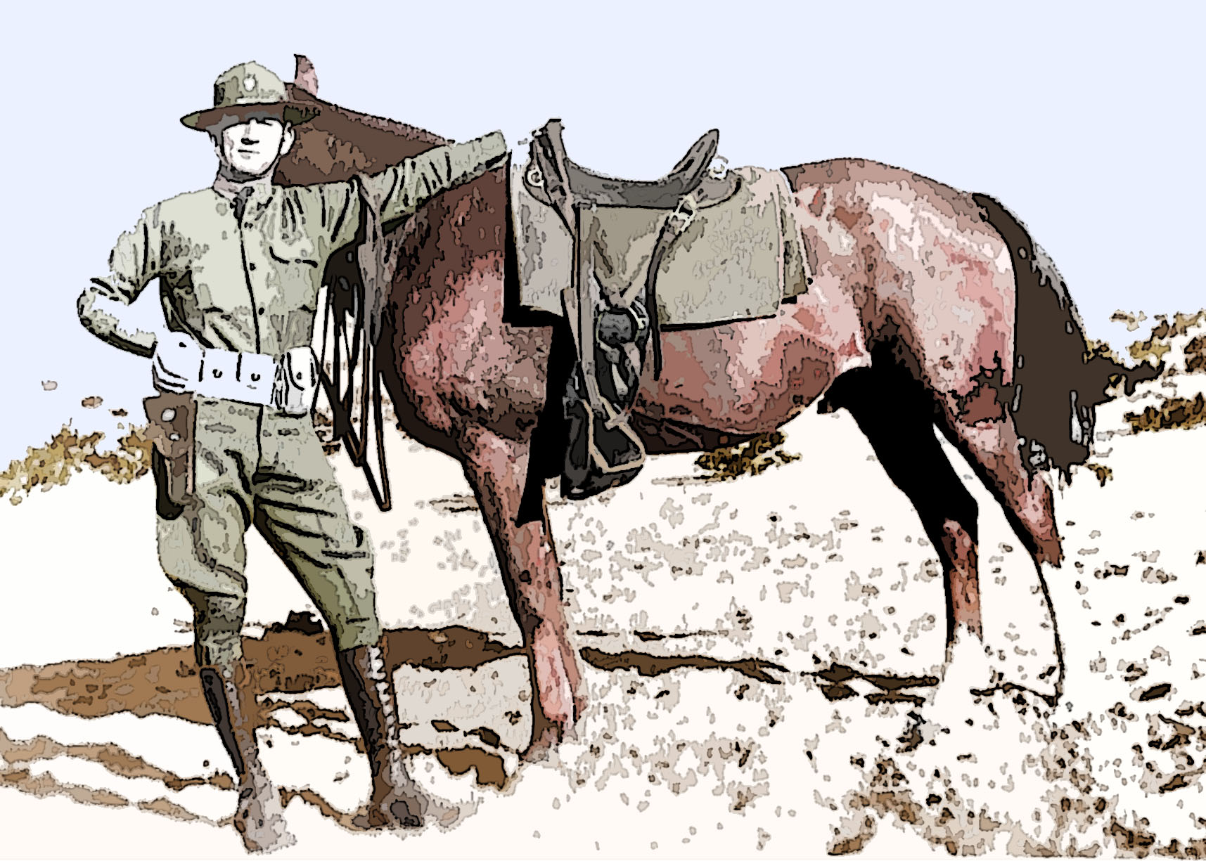 As I worked on my young cavalryman and his horse, I ruminated on the class discussions and blog commentary about the ethics of colorization. I remember when TMC started colorizing films, and the ruckus it created over such issues as the original artistic vision, the quality of the colorization itself, and misleading viewers. I also recall seeing a documentary about the craft of black and white filmmaking, which required creating effects to replace the role that color played — as a result, I often spend some time looking at the lighting and stage design in black and white films.